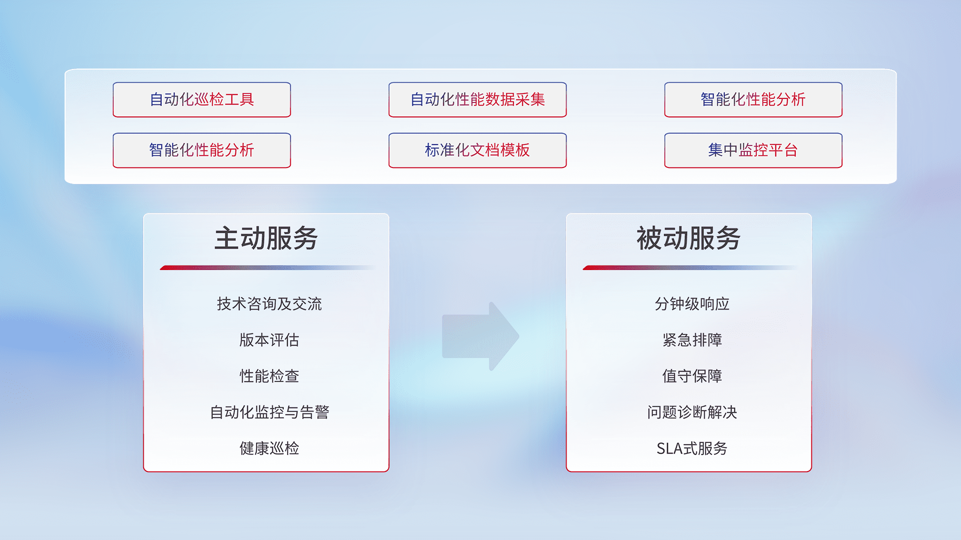 智能化工具和标准化文档,,保障服务质量,,提供主动服务(包含技术咨询、、、版本评估、、、性能检查、、自动化监控与告警、、、健康巡检)和被动服务包含(分钟级响应、、、、紧急排障、、、、值守保障、、问题诊断解决、、、SLA服务)。。