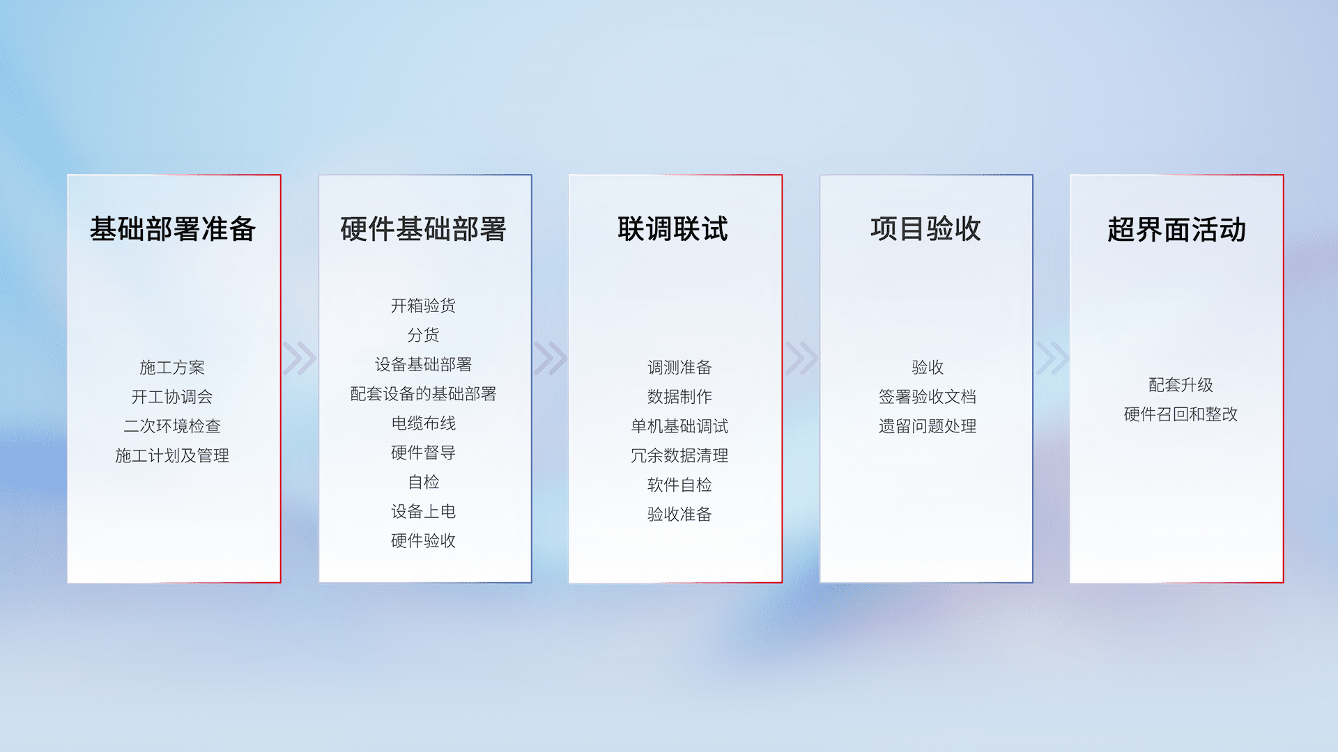 从基础部署准备、、、硬件基础部署、、联调联试、、、、项目验收、、、、越界面活动的全过程可追溯,,保证施工质量和进度。。。